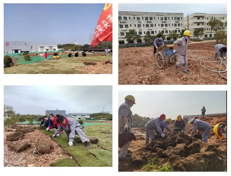 江西中材党总支响应绿色工厂创建动员,为抢抓好天气,发布“厂区主题公园草皮铺种”突击任务,群团组织积极响应,动员党员、团员青年、职工群众在工作间隙参加铺种任务。3月20日-21日,共动员80余人次参加,顺利完成约2500平草皮铺种任务。