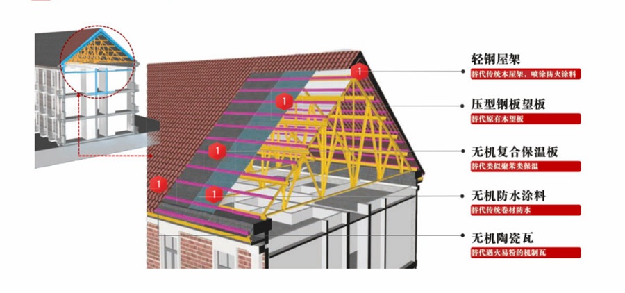 在近70年的老旧小区改造中,中国建材集团发挥产业链优势,统筹所属北新建材、国检集团等十余家专业企业,形成覆盖设计、材料、施工、检测的全链条解决方案。针对大屋脊结构消防隐患与功能缺陷,中国新材院、咸阳陶瓷院设计轻钢屋架体系,提升耐久性与抗震性能;北新灯塔更新产品设计,将防火涂料从耐火极限的2.5小时,提高到4.5小时,全面提高轻钢屋架体系的耐火极限;中岩科技、山东工陶院提供A级无机保温材料,实现防火保温双升级;江西中材研发发泡陶瓷防火隔离带,构建多层防护体系;北新防水、水泥新材院分别通过耐热防水卷材、无机复合防水材料,实现防水防火的双升级;国检集团与中存大数据,打造智慧监测系统,提升居住安全性;咸阳陶瓷院推出高吸水率A级防火陶瓷瓦,兼顾实用与美观。该综合解决方案推动木质大屋脊向“不燃、耐久、绿色、节能”现代屋顶系统转型,相关技术已在2025年11月北京鸟巢消防技术交流展中亮相,为全国同类项目提供可推广应用路径。