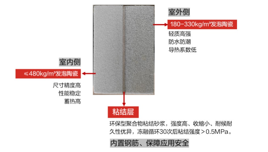 利用发泡陶瓷可灵活设计尺寸、热工性能、力学性能的特点,按照节能计算要求设计保温复合板构造;200mm产品传热系数0.59 W/(㎡.K),满足夏热冬冷地区节能计算要求。